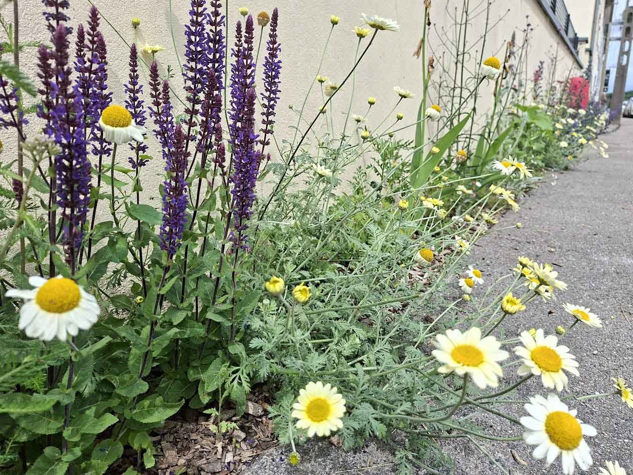 Par ailleurs, nous avons végétalisé les pieds de façade et aménagé une noue paysagère, permettant de canaliser l’eau tout en créant un milieu favorable au vivant.