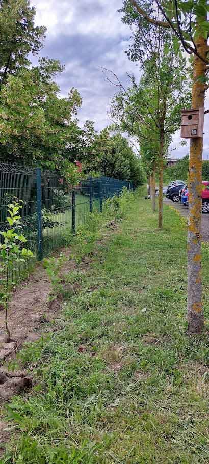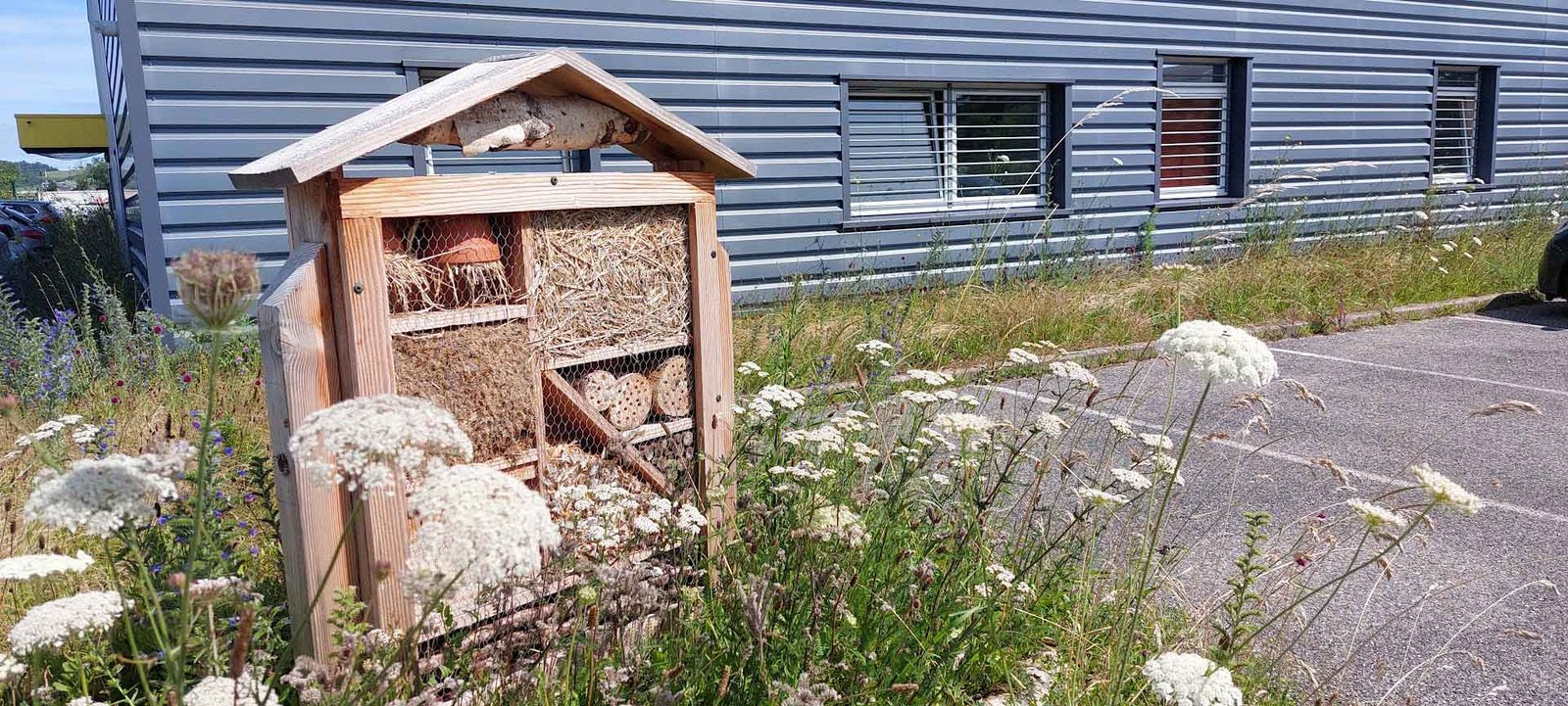 Par ailleurs, des zones dédiées au personnel ont été conçues (bancs, tables, bosquets comestibles), offrant des espaces de pause conviviaux et naturels. Enfin, des supports de communication, ainsi que l’installation de nichoirs et gîtes pour la faune, sont venus compléter le projet.