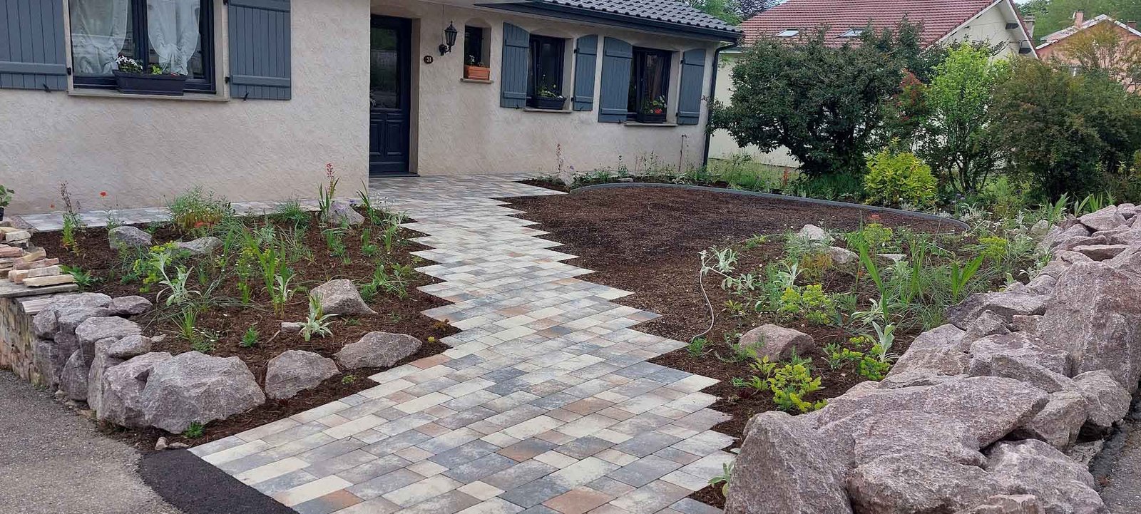 Afin d’améliorer l’accessibilité du jardin, nous avons d’abord supprimé un escalier et un muret devenus contraignants. Ensuite, nous avons créé une allée piétonne compatible PMR, réalisée en pavés perméables, permettant une circulation confortable et sécurisée tout en favorisant l’infiltration de l’eau dans le sol.